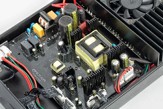 Chłodzenie wspomaga wentylator. Ścieżka sygnału faktycznie jest bardzo krótka. Końcówki są liniowe, pracują w klasie AB, jednak zasilacz jest impulsowy, co – jak się okaże w Laboratorium – zapewnia komfortowy rezerwuar mocy.
