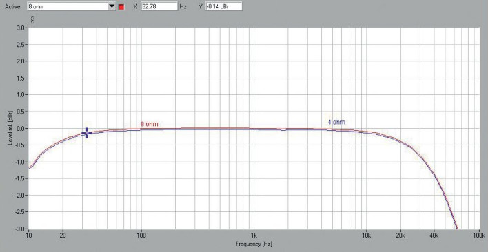 Firmowa specyfikacja nie obiecuje bardzo wysokiej mocy wyjściowej, chociaż pocieszające jest to, że przy dwa razy niższej impedancji (a więc przy 4 Ω względem 8 Ω) moc ma wzrosnąć dwukrotnie – z 50 W do 100 W. W pomiarach pojawiło się 2 x 58 W przy 8 Ω i 2 x 103 W przy 4 Ω, a przy jednym wysterowanym kanale "podwajanie" było niemal idealne (odpowiednio 59 i 117 W).