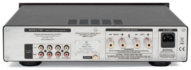 Zestaw wejść oferowanych przez Synthesis Roma 37DC jest skromny i praktyczny, z dwoma liniowymi i jednym gramofonowym (dla wkładek MM). Jest też wyjście z przedwzmacniacza – warto zastanowić się po co…Trudno przecież będzie przelicytować wysoką moc "własnych" końcówek mocy 37DC.