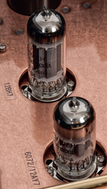 Wstępne wzmocnienie przygotowują podwójne triody 6072, a stopień sterujący to (również triody) 12BH7, w obydwu przypadkach pochodzące z amerykańskiej firmy Electro Harmonix.