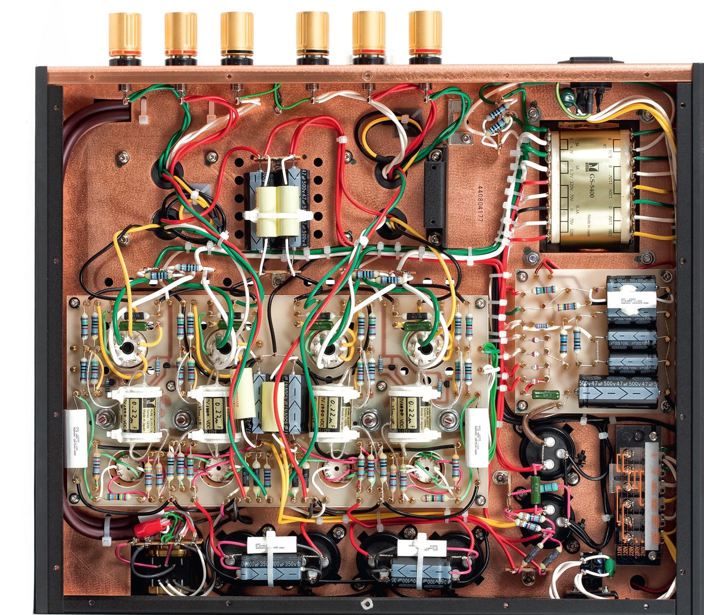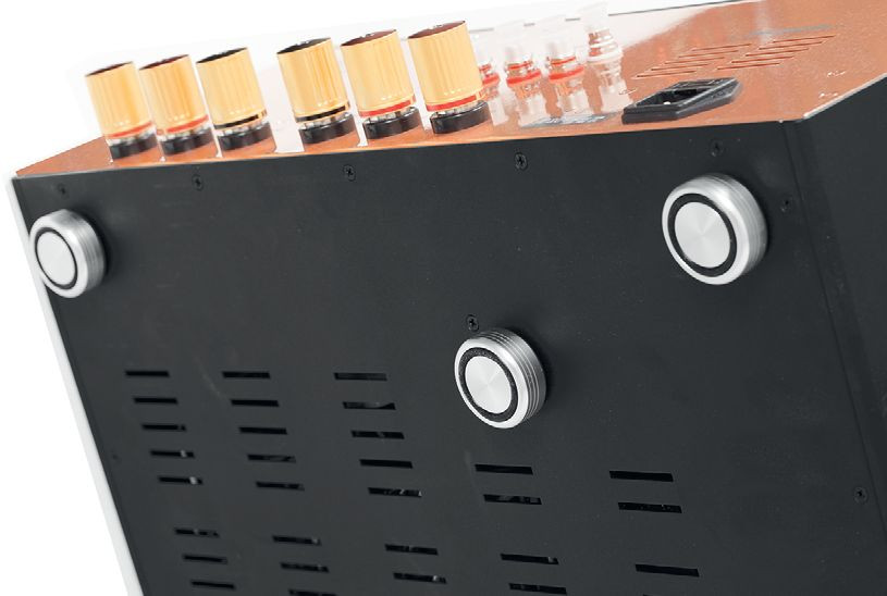 Wysokie wnętrze wzmacniacza Kondo Overture PM-2i jest podzielone na dwa piętra za pomocą poziomej, miedzianej płyty, która wzmacnia skrzynkę mechanicznie, a także stanowi barierę dla zakłóceń typu RFI.