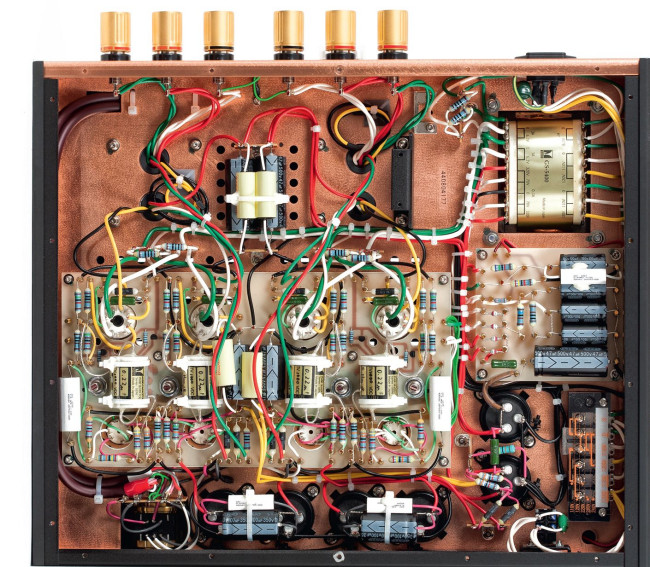 Patrząc od góry widzimy komplet lamp i transformatorów (zasilające, głośnikowe), jest tam też przełącznik źródeł – jeden z najbardziej niezwykłych elementów z punktu widzenia nowoczesnego wzmacniacza – to klasyczny, obrotowy "wybierak", umieszczony blisko tylnej ścianki.