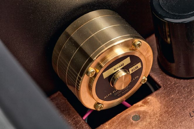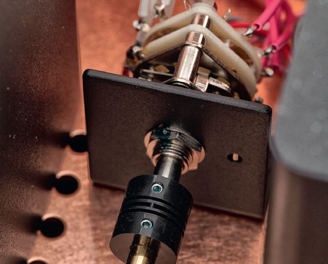Przełączanie wejść gałką na przednim panelu jest możliwe dzięki długiemu trzpieniowi, który spina dwa oddalone od siebie elementy. Potencjometr głośności (Alps) zabezpieczono dużą metalową osłoną.