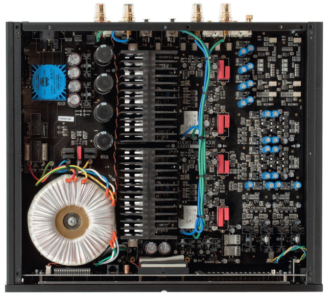 Środkową część konstrukcji zajmują dwa rozrośnięte bloki radiatorów. W dolnej części każdego z nich znajdują się dwie pary tranzystorów wyjściowych. Płytka z elektroniką wygląda nowocześnie; staranny projekt, precyzyjny montaż i elementy SMD zapewniły krótką ścieżkę sygnału i w konsekwencji niskie szumy.