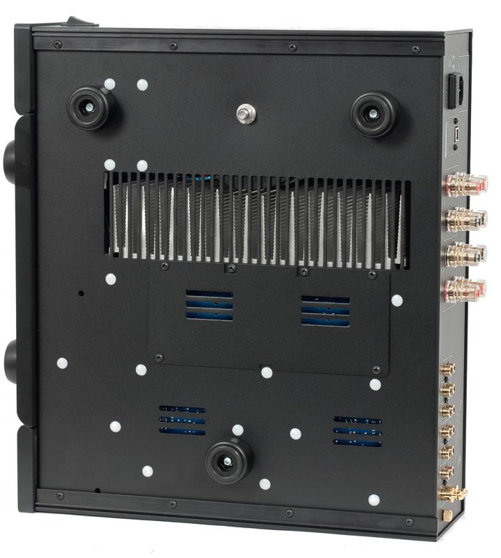 Kolejne pary RCA to wyjście subwooferowe (stereo!) oraz niskopoziomowe wyjście tajemniczo opisane USB OUT. Instrukcja obsługi na ten temat milczy, wiemy tylko, że to wyjście liniowe, najprawdopodobniej na stałe podłączone do sekcji przetwornika cyfrowo- -analogowego, pozwalające na jego niezależne wykorzystanie… Terminale głośnikowe są podwójne.