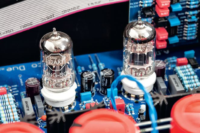 Wzmacniacz jest ciężki, a chassis bardzo solidne. W części przedwzmacniacza pracuje duet lamp ECC83 – to wybór niemal oczywisty. Tę popularną podwójną triodę często stosuje się nie tylko w przedwzmacniaczach, ale także w urządzeniach źródłowych.