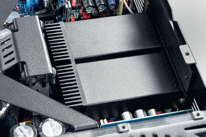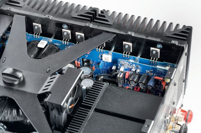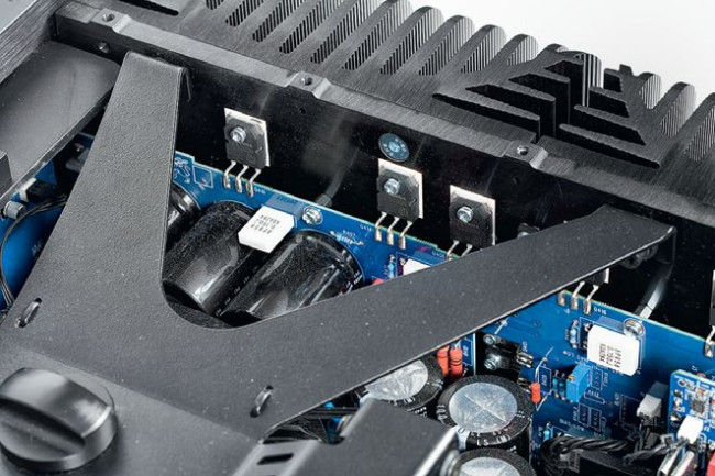 W każdym kanale pracuje aż dwanaście bipolarnych par Toshiba 2SA-1943/2SC200. Umieszczono je na grubych płytach bocznych, a dopiero do nich dokręcono radiatory.