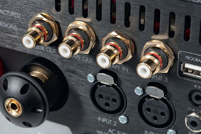 Sekcja przedwzmacniacza wylądowała niżej, w tylnej części obudowy. Wejścia sterowane są przekaźnikami, regulacja głośności to autorski układ złożony z precyzyjnych rezystorów i przełączników (stąd charakterystyczne stuki towarzyszące zmianie ustawień); zależnie od wybranego poziomu, w ścieżce sygnałowej znajduje się jeden lub dwa rezystory.
