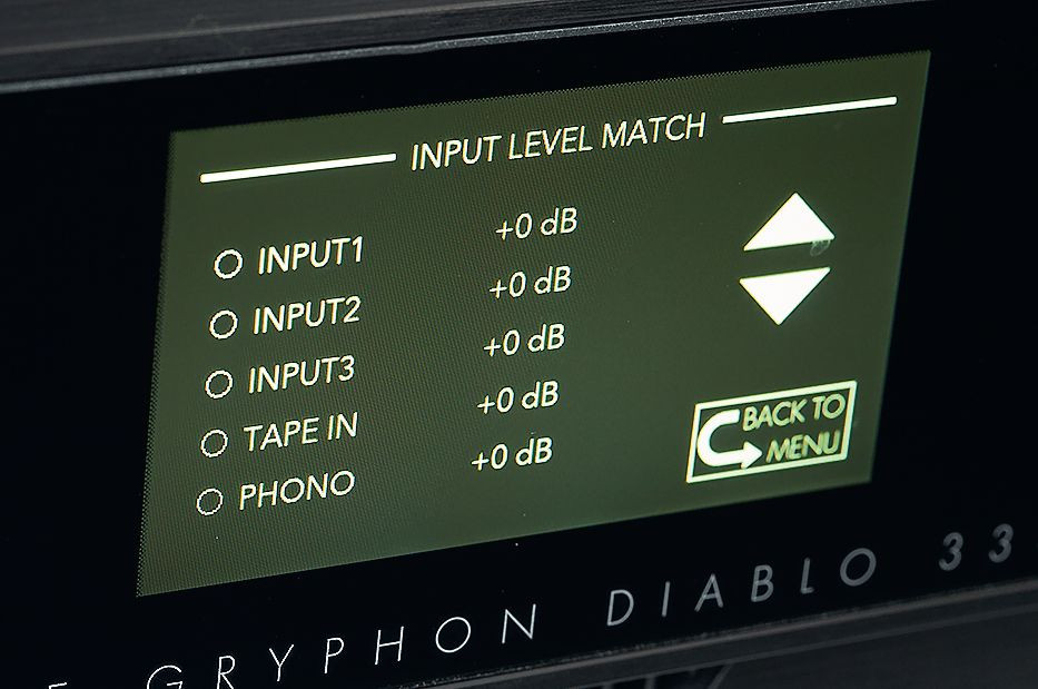 Gryphon przygotował też menu, jednak nie zawraca głowy zbyt skomplikowanymi ustawieniami. Jest tutaj zmiana czułości wejść i ich (indywidualnych) nazw, możliwość zdefiniowania początkowego oraz maksymalnego poziomu głośności, wreszcie regulacja jasności wyświetlacza. Ten pełni jednak jeszcze jedną, ukrytą rolę. Prawdopodobnie nigdy się z nią nie zetkniemy, ale problemy i nieprawidłowości pracy, raturą czy obecnością składowej stałej w sygnale, byłyby tutaj sygnalizowane.