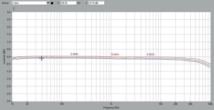 Na rys. 1. umieściliśmy tym razem nie dwie, jak zazwyczaj, ale trzy charakterystyki. Krzywe 8-omowe i 4-omowe zostały uzupełnione 2-omową (kolor czarny). Niezależnie od obciążenia zachowana jest wzorowa liniowość, przy 100 Hz spadek jest śladowy – ok. 0,5 dB.