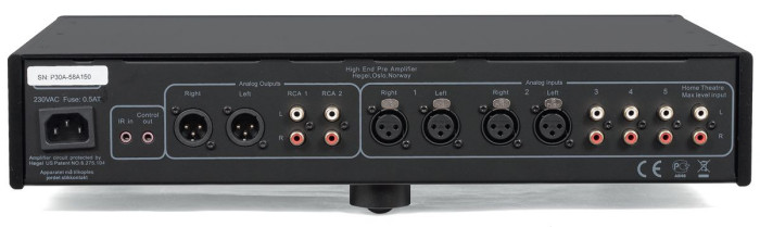 Hegel P30A przyjmuje wyłącznie sygnały analogowe, liniowe, przez dwie pary XLR oraz cztery RCA; jedna służy do zadań specjalnych – integracji z systemami wielokanałowymi.