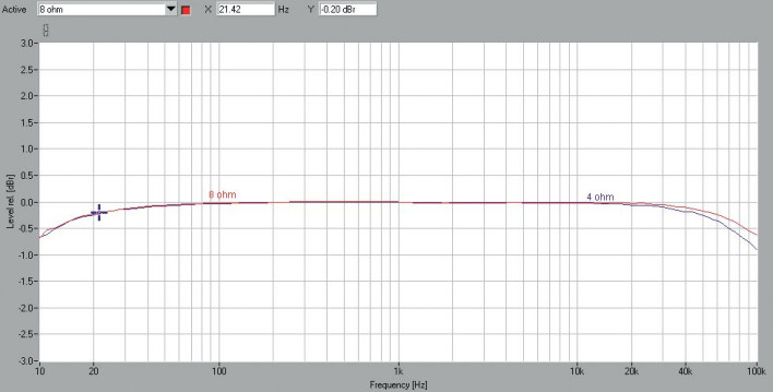 Dynamika 108 dB to w dużej mierze zasługa wysokiej mocy. Charakterystyki częstotliwościowe (rys. 1) prezentują się znakomicie, spadek przy 10 Hz to nieistotne -0,6 dB, podobnie jak przy 100 kHz -0,6 dB i -0,8 dB, odpowiednio przy 8 i 4 Ω.