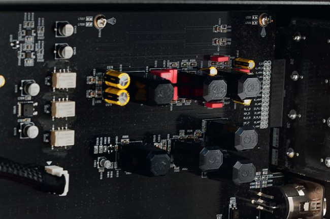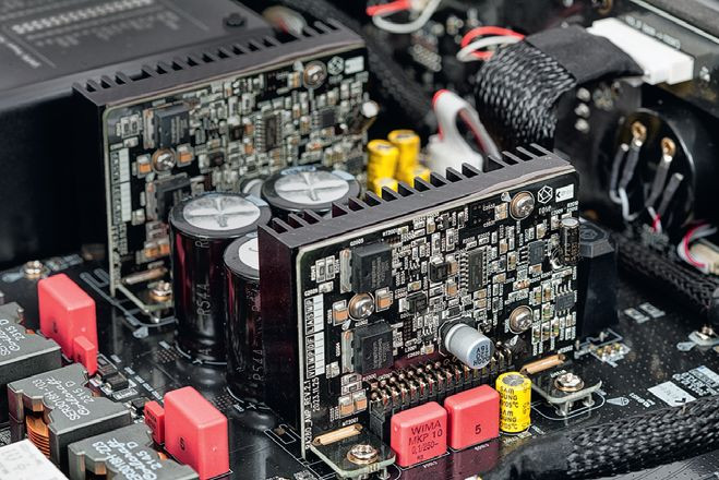 Odsunięcie ich poza moduły końcówek utrudnia jednak uruchomienie obwodów korekcyjnych niwelujących problemy z liniowością charakterystyk przetwarzania. W niewielkim module, ulokowanym w lewym, przednim rogu obudowy, znajduje się układ obsługujący komunikację sieciową (przekazujący informacje między wzmacniaczem a aplikacją mobilną); w pobliżu widać więc moduł z anteną Wi-Fi.