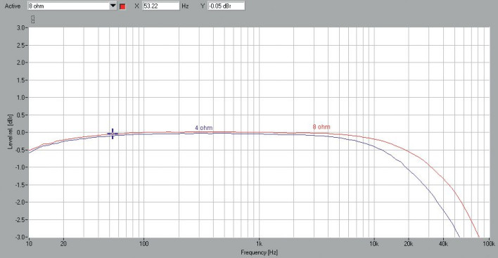 Charakterystyki częstotliwościowe (rys. 1) ujawniają śladowy spadek w zakresie niskotonowym (-0,5 dB przy 10 Hz). W zakresie wysokich częstotliwości faworytem jest obciążenie 8-omowe, przy nim charakterystyka opada łagodniej, a -3 dB osiągamy przy 81 kHz; -3 dB przesuwa się do 55 kHz przy 4 Ω – wciąż nie ma się czym martwić. Ciekawie wygląda spektrum harmonicznych (rys. 2).