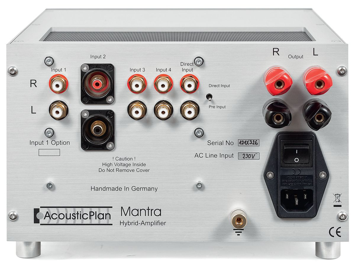 Tylna ścianka wzmacniacza Acoustic Plan Mantra jest "elastyczna". Miejsca montażowe na gniazda przygotowano w taki sposób, aby można było część z nich zastąpić innymi, instalując wewnątrz dodatkową elektronikę. O miejscu produkcji jednoznacznie świadczy napis "Handmade In Germany".