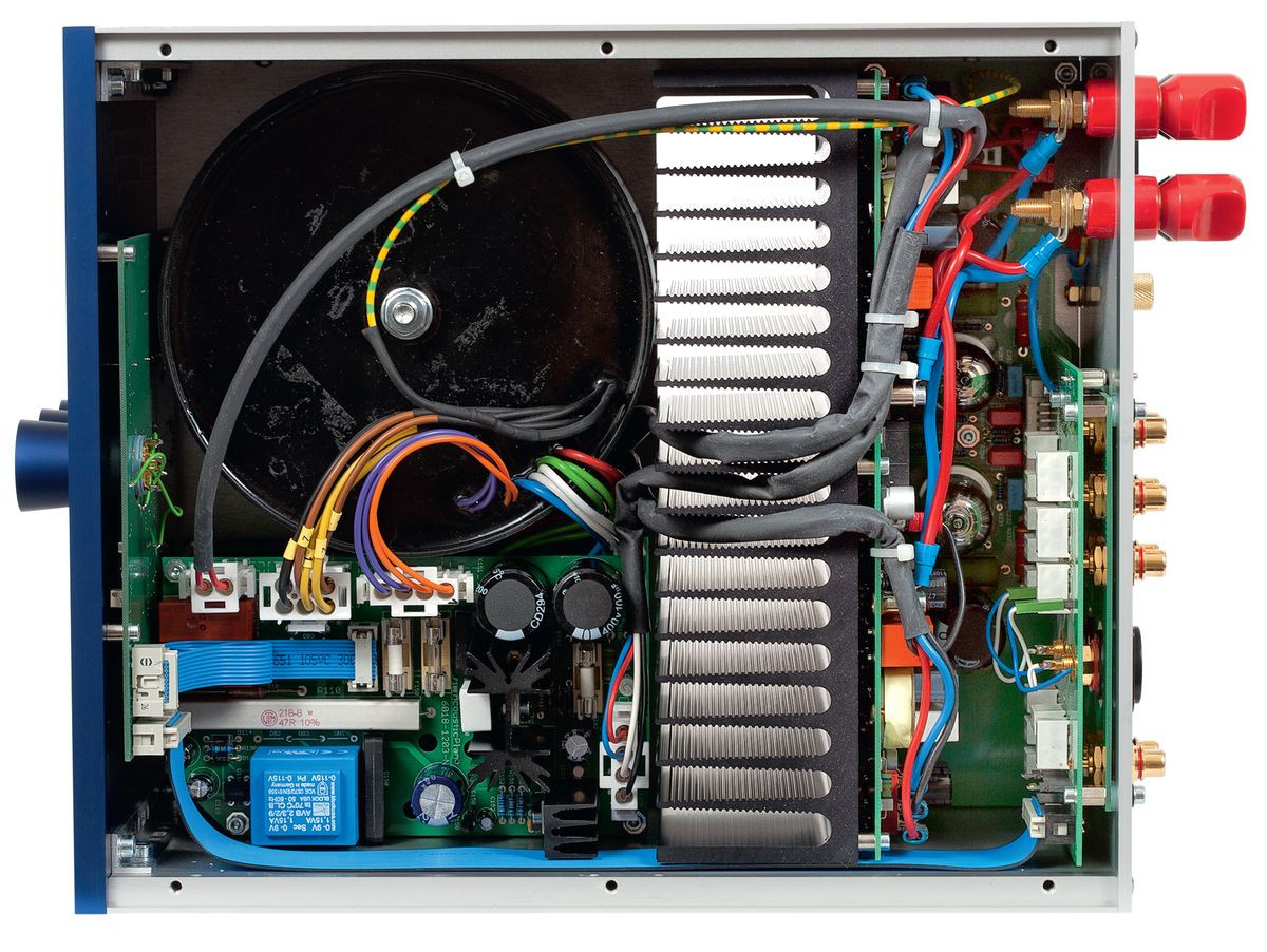 Tor sygnałowy rozpoczyna się od dodatkowej płytki z gniazdami RCA oraz przekaźnikami (wybór źródeł). W sekcji końcówek mocy zwraca uwagę potężny radiator, na którym umieszczono nie tylko tranzystory wyjściowe, ale i rozbudowany zestaw zabezpieczeń, m.in. układy reagujące na zbyt wysoką temperaturę. W tym przypadku może mieć to znaczenie wykraczające poza dobry obyczaj.