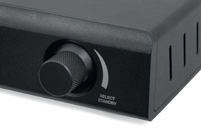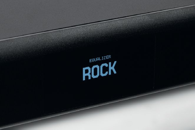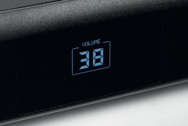 Urządzenie ma tylko 28 cm szerokości i 6 cm wysokości. Obudowa została wykonana bardzo solidnie (aluminium), prezentuje się nowocześnie, ale dyskretnie. Spory wyświetlacz nie eksploduje ani soczystymi kolorami, ani nowoczesną grafiką – ma bladoniebieski odcień i skupia się na sprawach podstawowych, głównie informacjach o wybranym wejściu i ustalonym poziomie głośności. Właściwie wszystkie funkcje obsłużymy jednym pokrętłem.