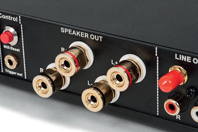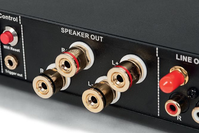 Z kolei wejście optyczne może się przydać do podłączenia telewizora. NuPrime Omnia A200 ma także niskopoziomowe wyjście RCA oraz wyjście cyfrowe (współosiowe). Niska obudowa nie pozwoliła na luksusy, terminale głośnikowe są pojedyncze i z braku miejsca ustawione na skos.
