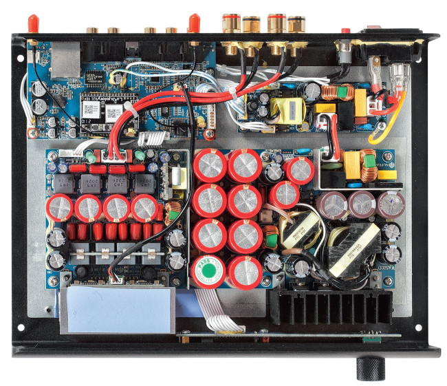 W kompaktowej obudowie jest niewiele wolnego miejsca, większość zajmują dwa moduły z towarzyszącymi im radiatorami. Gdy patrzymy na wzmacniacz od frontu, moduł prawy to zasilacz, lewy (z grafitowymi "puszeczkami" przy radiatorze) to blok końcówek mocy.