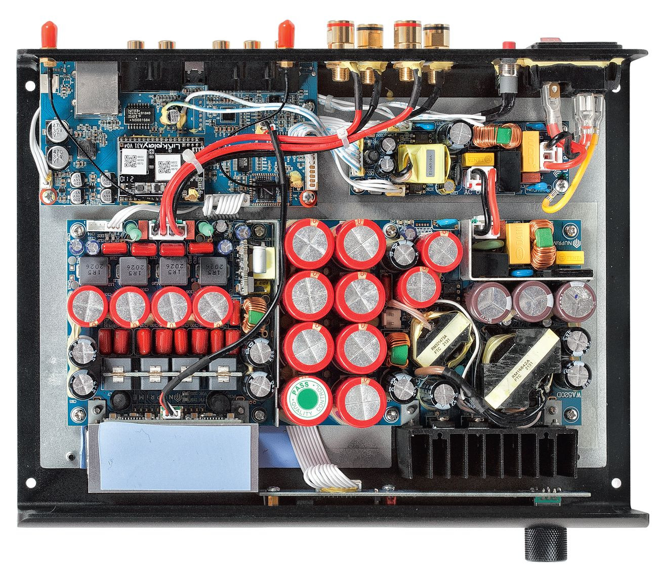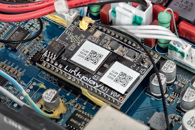 Na dużej płytce widnieje logo firmy, co wskazuje na jej własny projekt tych układów. W tylnej części znajduje się elektronika cyfrowa i strumieniowa (procesor Mediatex dla sekcji sieciowej oraz Qualcomm dla transmisji Bluetooth – z kodowaniem aptX HD).