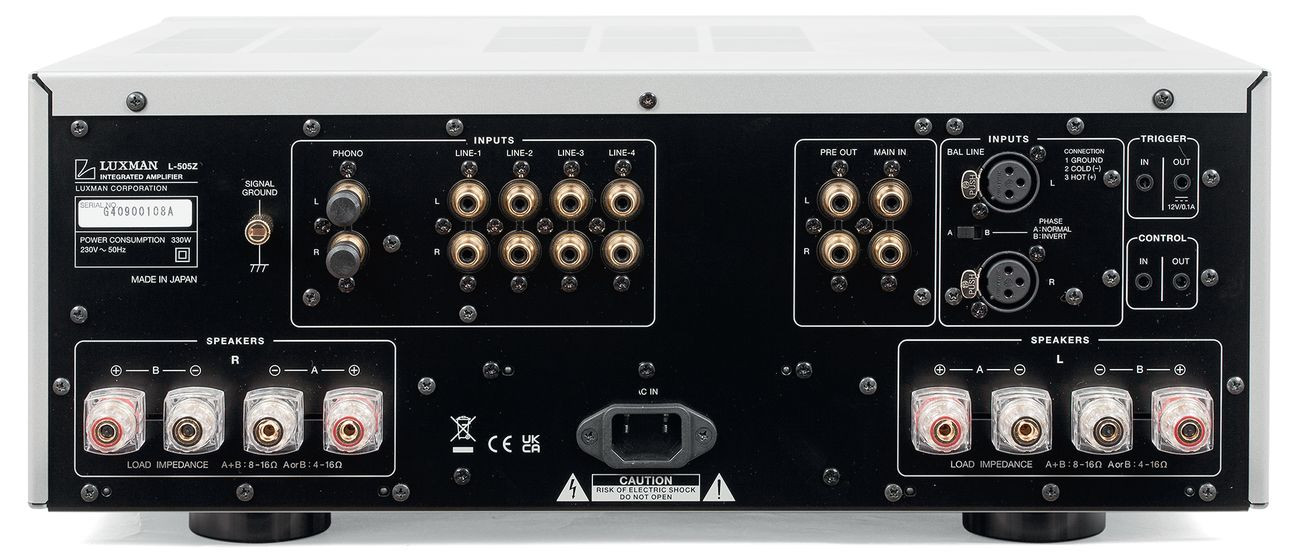 Wejścia liniowe są cztery w formacie RCA i jedno XLR. L-505Z ma wejście gramofonowe, które obsługuje dwa typy wkładek (MM oraz MC). Parametry obciążenia są dość typowe (w przypadku trybu MC, gdzie jest to szczególnie istotne, impedancja obciążenia wynosi 100 Ω).