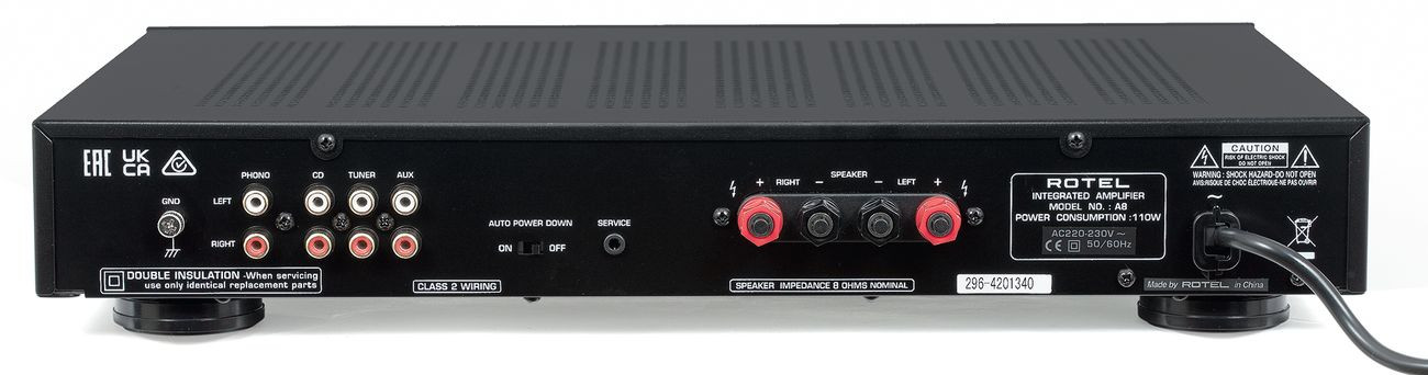Również nie po raz pierwszy Rotel stosuje tranzystory Sankena; w A8 pracują po dwa na kanał, wszystkie cztery są przykręcone do jednego radiatora. W przedwzmacniaczu ważne role pełnią układy scalone, realizujące funkcje przełączania źródeł oraz regulacji głośności. W ten sposób Rotel zadbał o krótką ścieżkę sygnału.