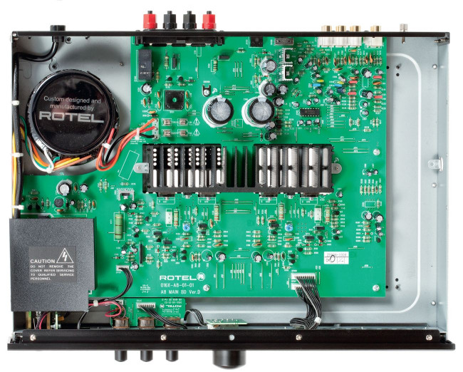 We wnętrzu Rotela A8 widać układ typowy dla wielu wzmacniaczy Rotela. Większość elementów znajduje się na jednej, bardzo dużej płytce drukowanej. W środku umieszczono końcówki mocy, a w miejscach montażu radiatorów płytka drukowana jest wycięta, co sprzyja chłodzeniu.