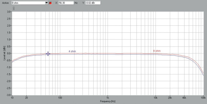 Charakterystyki częstotliwościowe (rys. 1) pokazują niewielkie spadki na skrajach mierzonego pasma (daleko poza zakresem akustycznym), -0,5 dB przy 10 Hz oraz ok. -1,5 dB przy wysokich 100 kHz.