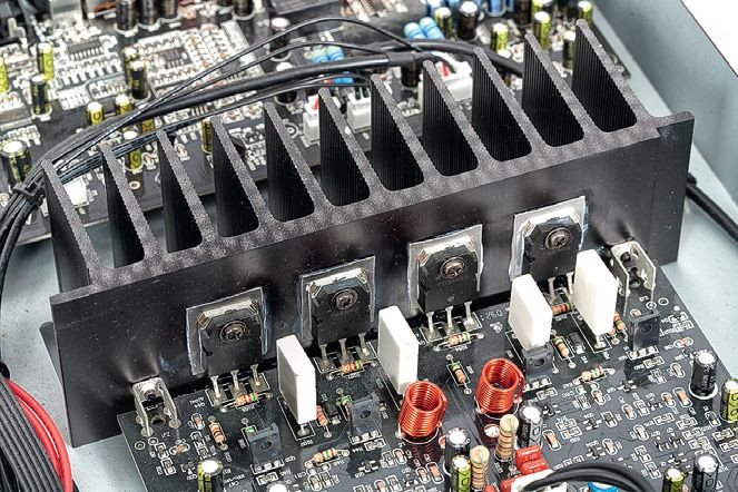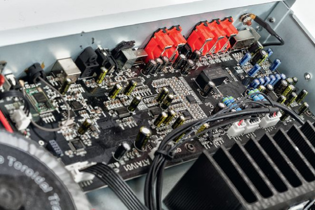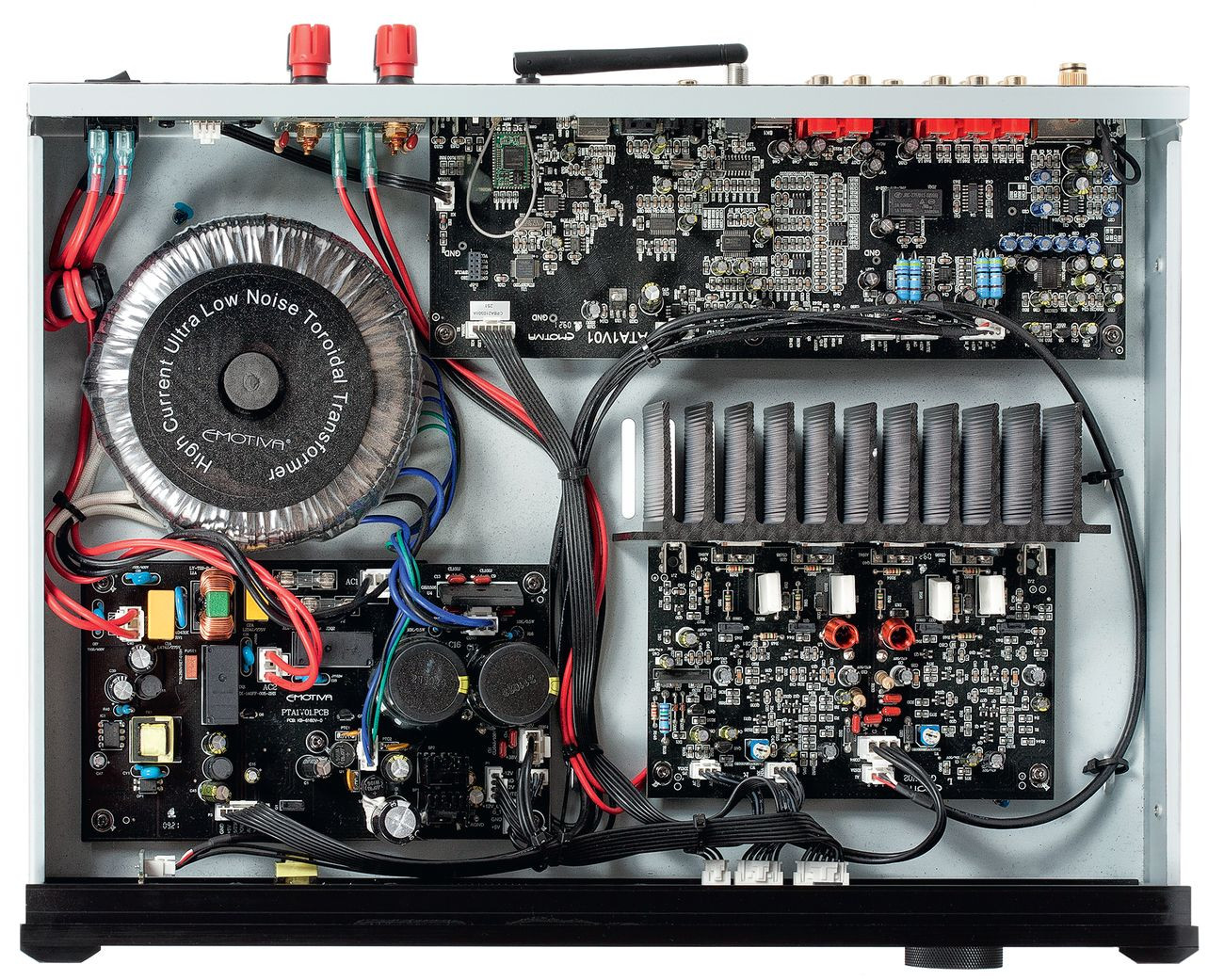 Nie licząc pomocniczego modułu przy przedniej ściance, elektronikę rozlokowano na trzech płytkach. Podstawą zasilacza jest transformator toroidalny. Układy audio podzielono wyodrębniając przedwzmacniacz i końcówki mocy pracujące w klasie AB. Na stosunkowo niedużym radiatorze zainstalowano w sumie cztery (po dwa na kanał) bipolarne tranzystory mocy firmy Toshiba (2SA1941/2SC5198).