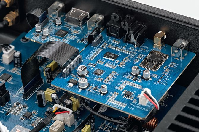 Obok jest jeszcze mały moduł Bluetooth (Qualcomm). Już po przetworzeniu na postać analogową, sygnały z wybranego wejścia są ściągane za pomocą krótkiego odcinka przewodu na płytkę analogową piętro niżej i trafiają do sekcji przedwzmacniacza.