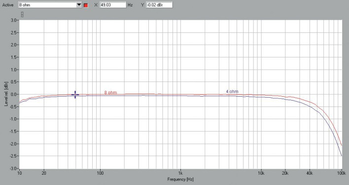 Charakterystyki częstotliwościowe (rys. 1) wyglądają znacznie lepiej niż w zapowiedziach, nawet przy granicznych w naszym pomiarze 100 kHz spadek jest mniejszy niż 3 dB (-2 dB dla 8 Ω i -2,5 dB dla 4 Ω) – to zupełnie "normalny" wynik.