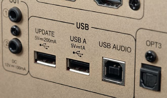 W części cyfrowej mamy trzy wejścia optyczne, jedno współosiowe, USB w formule USB-DAC (przyjmuje sygnały PCM 32 bit/384 kHz i DSD256) oraz USB-A (dla nośników pamięci, ale obsługiwane są tylko pliki MP3).