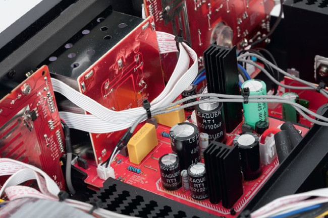 Zasilacz ulokowano dość nietypowo, przykręcając transformator toroidalny do wspornika przy jednej z bocznych ścianek, stąd nierównomierny rozkład masy (co jednak nie ma większego praktycznego znaczenia, gdy wzmacniacz stanie już na szafce).