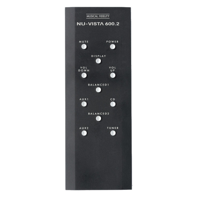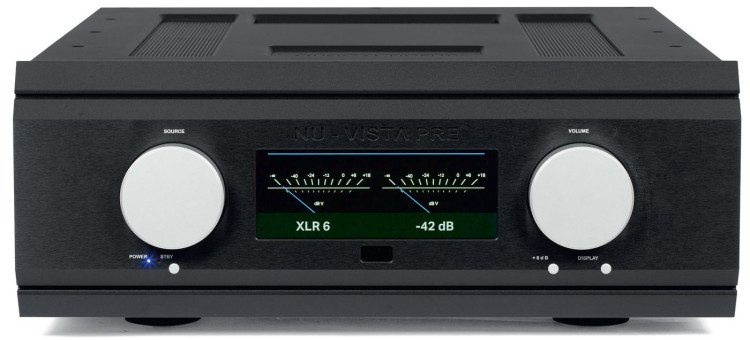 Front Musical Fidelity Nu-Visa PRE jest masywny, odrobiny finezji dodają mu ścięcia dolnej i górnej krawędzi. W centrum umieszczono równie imponujący wyświetlacz, na którym pojawi się sygnalizacja wybranego wejścia oraz ustawionego poziomu głośności, a także coś specjalnego – animacja wskaźników wychyłowych.