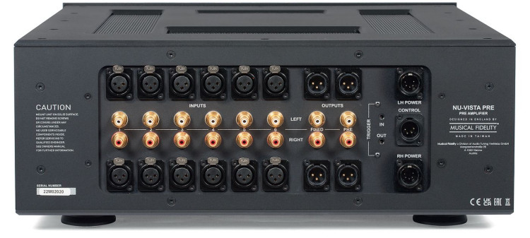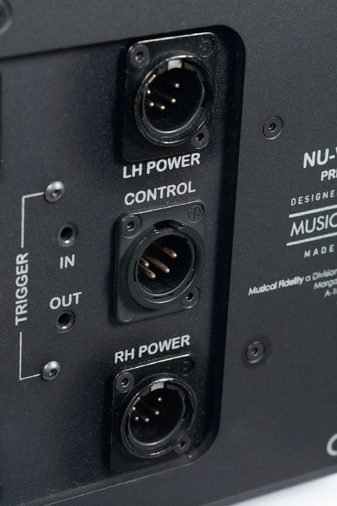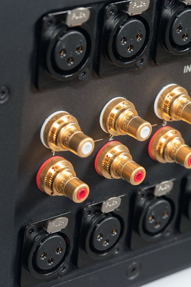 Sygnały wysokopoziomowe wyprowadzamy z dwóch par luksusowych zacisków z grubymi, złoconymi nakrętkami (i logo Nu-Vista). Musiały też pojawić się złącza dla zewnętrznego zasilania w jeszcze bardziej okazałej konfiguracji niż w PRE; dwa kable służą stopniom wyjściowym, kolejne dwa – wejściom (z Nuwistorami), a dodatkowy przesyła sygnały sterujące.