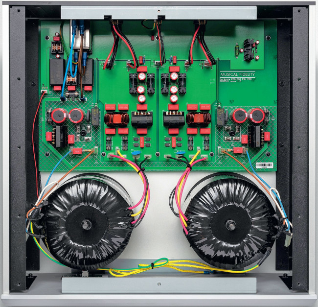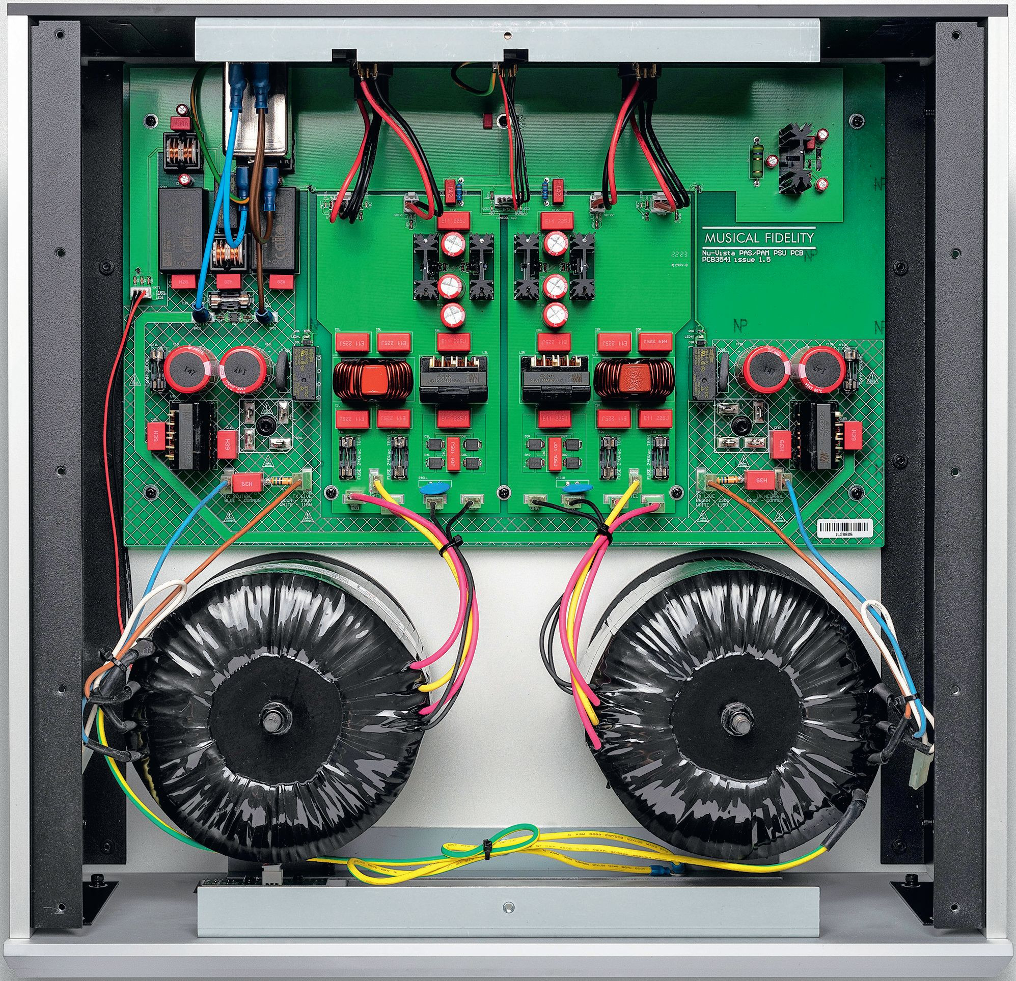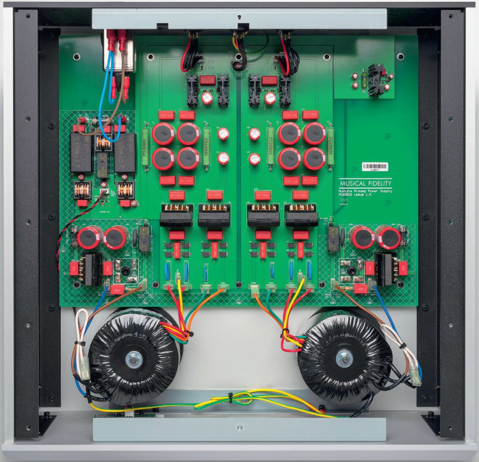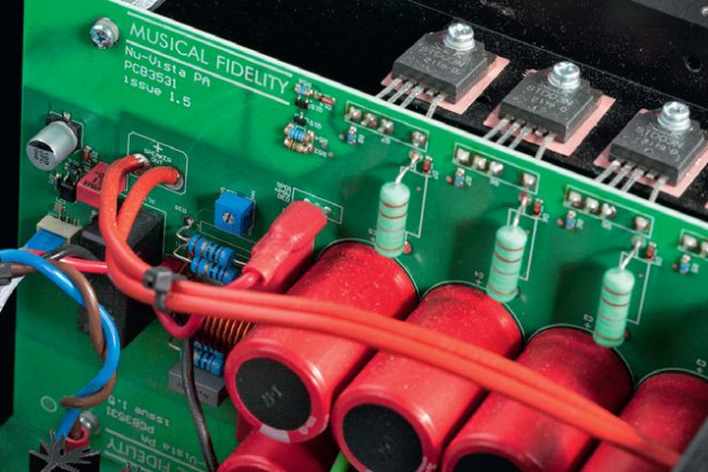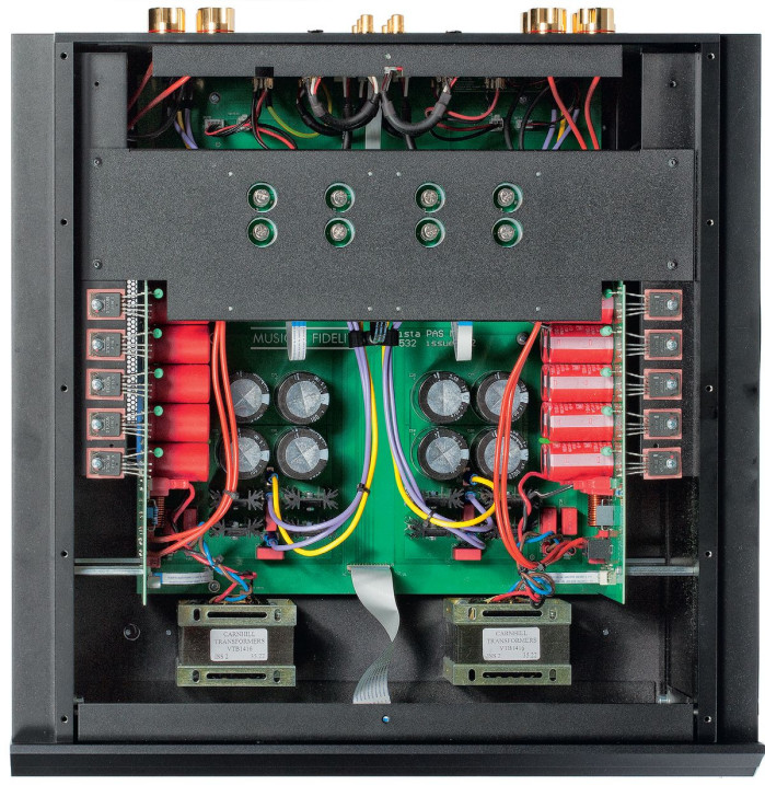 Obudowa samego Musical Fidelity Nu-Vista PAS również zawiera część modułów zasilających, co jest między innymi rezerwą energii (kondensatory filtrujące) dla końcówek. Nuwistory, podobnie jak w PRE, zostały umieszczone na górnym pokładzie i dodatkowej belce wzmacniającej. Obwody półprzewodnikowe zajmują dwie spore płytki drukowane w pobliżu bocznych ścianek (te służą jako radiatory).
