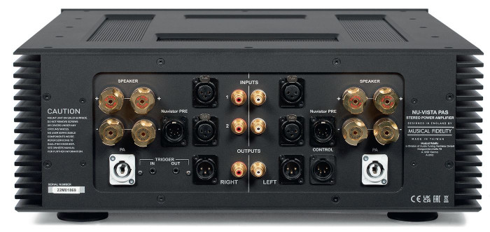 Tylny panel Musical Fidelity Nu-Vista PAS jest jednym z najbardziej rozbudowanych, jakie występują w końcówkach mocy. Nu-Vista PAS ma aż cztery wejścia – dwa RCA i dwa XLR (niezależne). Są też niskopoziomowe wyjścia (także RCA i XLR), pewnie z myślą o podłączeniu kolejnych końcówek PAS i zasilaniu kolumn głośnikowych w formule bi-ampingowej (a może nawet tri-ampingowej).
