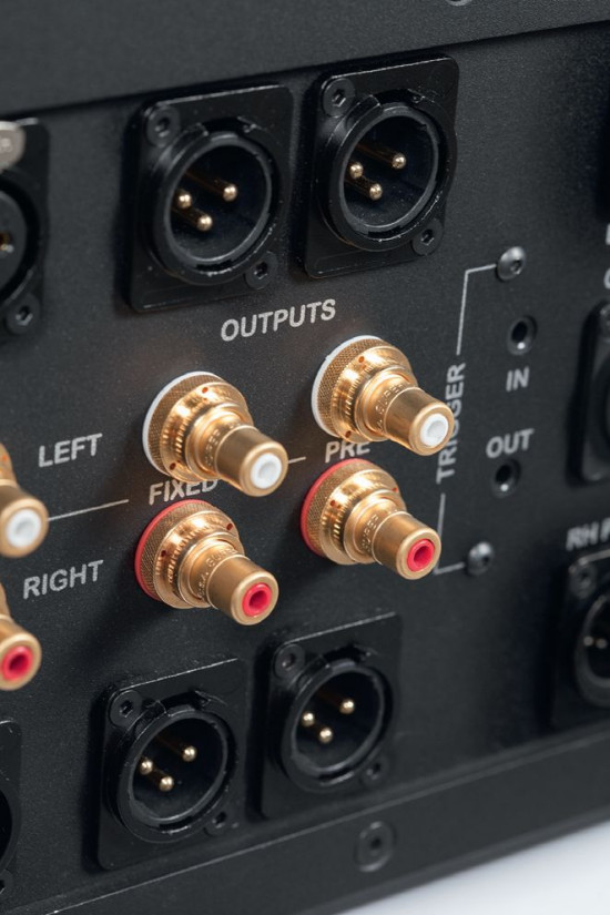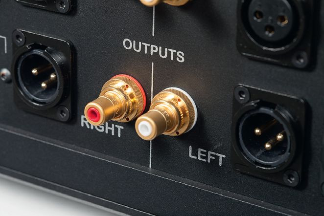 Wyjścia zorganizowano w dwie grupy, o stałym i regulowanym poziomie, w każdej jest RCA i XLR.