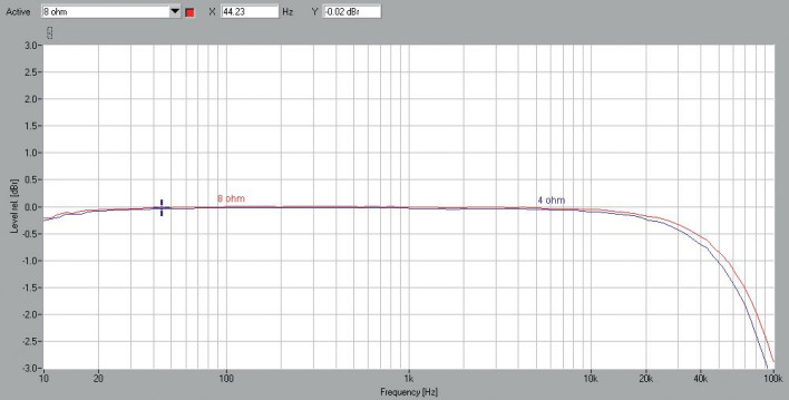 Większych zastrzeżeń nie można mieć do charakterystyk częstotliwościowych (rys. 1); chociaż powyżej 20 kHz widać zaczynający się spadek, to -3 dB odczytujemy dopiero przy 100 kHz dla 8 Ω i 90 kHz dla 4 Ω.