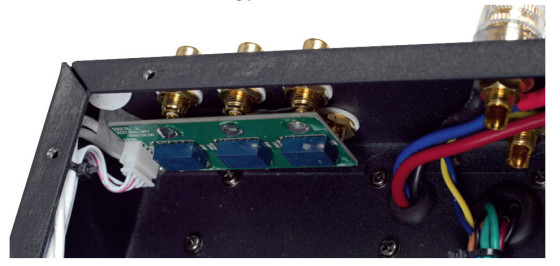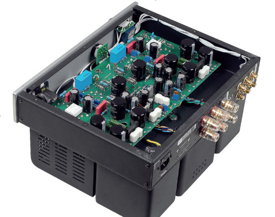 Niemal cały układ wewnątrz został zmontowany na jednej drukowanej płytce. Wyjątkiem jest mała płytka z przekaźnikami, z której biegnie sygnał do klasycznego, obrotowego potencjometru "Blue Velvet" Alpsa, a stamtąd, takimi samymi kablami do triody na wejściu. Jest to więc układ z przedwzmacniaczem aktywnym, w którym potencjometr znajduje się przed elementem wzmacniającym.
