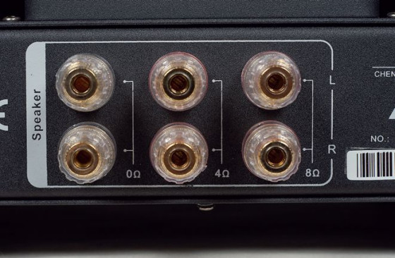 Z tyłu widzimy dobre zaciski głośnikowe, z odczepami dla obciążeń 4 i 8 omów, jedynie trzy wejścia liniowe, ale na dobrych, zakręcanych gniazdach RCA oraz gniazdo sieciowe IEC. Nie ma żadnych wyjść liniowych.