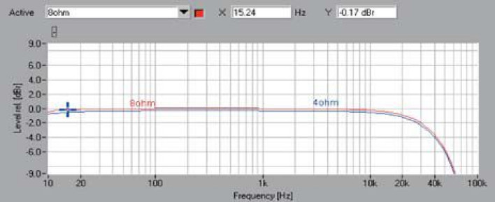 Wzmacniacz Naima cechuje bardzo wysoka czułość - do uzyskania mocy znamionowej wystarczy podać na jedno z wejść liniowych napięcie o wartości zaledwie 0,13 V, co zresztą idealnie pokrywa się ze specyfikacją producenta. Moc jest z nią także zgodna, XS oferuje 61 W przy 8 omach i 100 W przy 4 omach; w stereo wyniki 2 x 57 W oraz 2 x 86 W można uznać za przyzwoite, chociaż dalekie od rekordów.