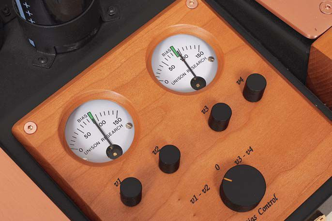 Na środku górnej ścianki umieszczono dwa wskaźniki (miliamperomierze), dzięki którym łatwo ustawimy odpowiedni bias dla lamp końcowych. Niemal zawsze potrzebny jest do tego zewnętrzny miernik; tutaj zintegrowano go ze wzmacniaczem z korzyścią i dla projektu plastycznego, i dla wygody użytkowników.