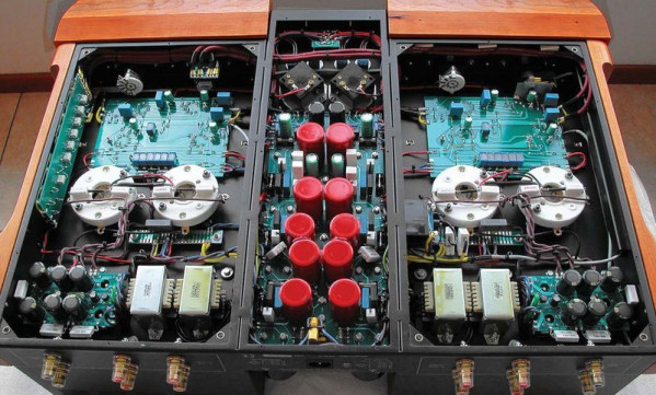 Podobne rozwiązanie można także oglądać w przygotowanej przez Audio Note wersji wzmacniacza - Ongaku, ale palma pierwszeństwa należy się Włochom. Części boczne zawierają lampy, część środkowa - kondensatory zasilacza.