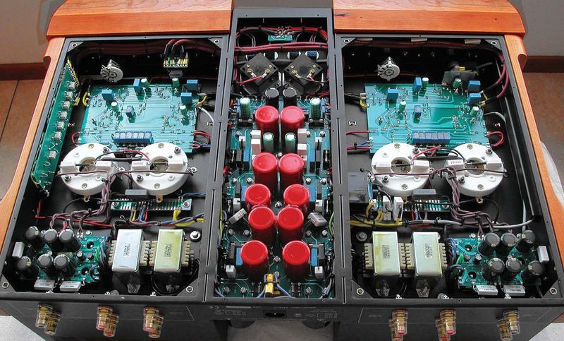Sekcja przedwzmacniacza została zmontowana na małych drukowanych płytkach. Widać na nich znakomite kondensatory polipropylenowe Evoxa, sprzęgające poszczególne stopnie. Potężne, ceramiczne gniazda dla lamp końcowych mają złocone piny.