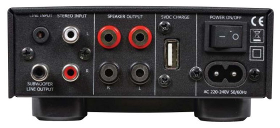 Jedynie dwa wejścia liniowe – RCA oraz mini-jack. Przez port USB możemy ładować urządzenia MP3, a dzięki wyjściu subwooferowemu zwiększyć potencjał mocowy całego systemu.