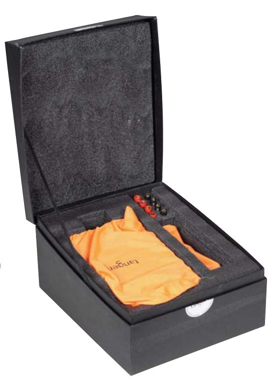 Urządzenie przybywa w eleganckim opakowaniu, z pomarańczowym, miękkim „pokrowcem”, kabelkiem połączeniowym mini-jack do MP3 i dwoma kompletami bananowych wtyków.