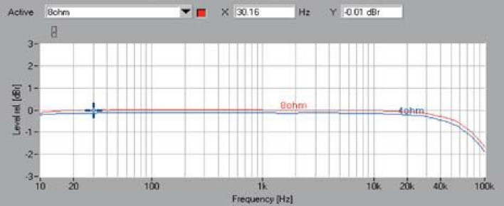 Za podobieństwami konstrukcyjnymi wzmacniaczy Bladelius oraz DLS idą także wyniki pomiarów. Firma Bladelius określając moc wyjściową na 100 W przy 8 omach, nie zdradza jednak potencjału urządzenia na obciążeniu 4-omowym. Wzmacniacz pracuje stabilnie w obydwu warunkach, dostarczając 103 W przy 8 omach (2 x 99 W w stereo) oraz 180 W przy 4 omach (2 x 175 W w stereo).