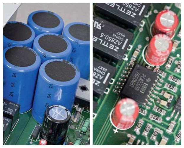 Przedwzmacniacz i wstępne stopnie końcówek są objęte szczególną ochroną, bo mamy tu sporo stabilizatorów napięcia, gdzie zastosowano drogie kondensatorki amerykańskiej firmy Dubilier o podniesionej specyfikacji temperaturowej.
