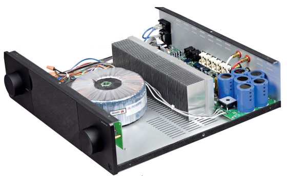 Cały układ zmontowano na jednej drukowanej płytce, umieszczonej przy tylnej ściance. Trafo przy przedniej ściance oddzielone jest od solidnym radiatorem. Wejścia przełącza się za pomocą hermetycznych przekaźników japońskiej produkcji.